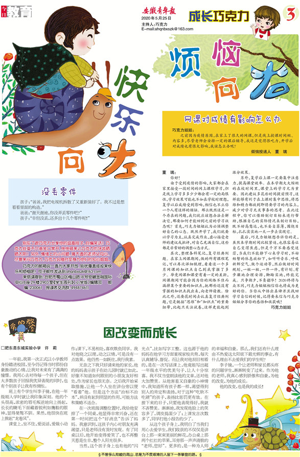 《安徽青年报·学生周刊》励志启智,开阔视野,净化心灵,陶冶情操,参与互动,集新闻性、知识性、趣味性、互动性为一体,是小学生成长的良师益友、参与互动的平台、沟通老师家长的纽带。