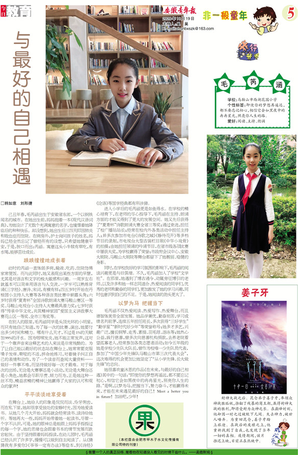 《安徽青年报·学生周刊》励志启智,开阔视野,净化心灵,陶冶情操,参与互动,集新闻性、知识性、趣味性、互动性为一体,是小学生成长的良师益友、参与互动的平台、沟通老师家长的纽带。
