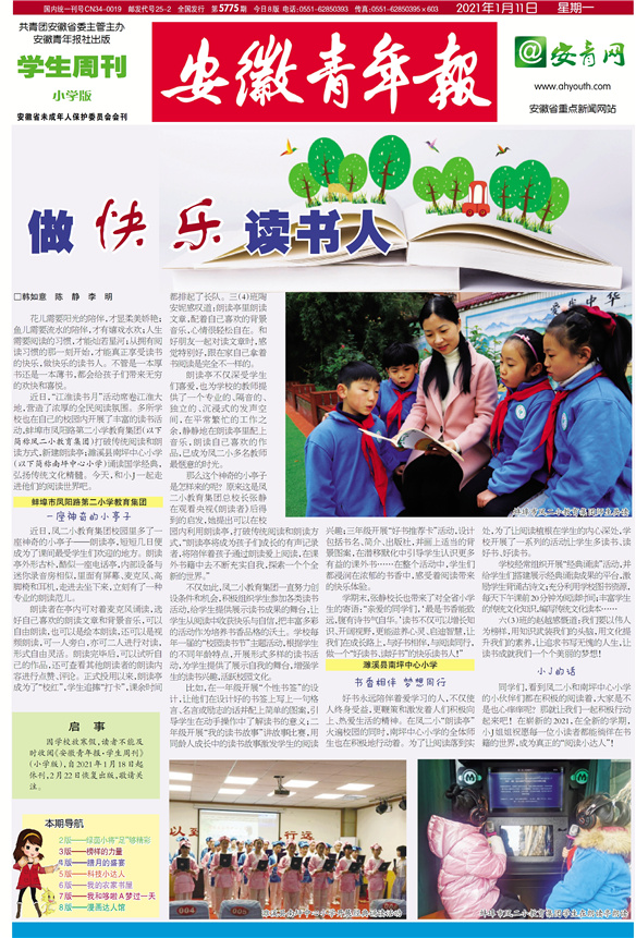 《安徽青年报·学生周刊》励志启智,开阔视野,净化心灵,陶冶情操,参与互动,集新闻性、知识性、趣味性、互动性为一体,是小学生成长的良师益友、参与互动的平台、沟通老师家长的纽带。