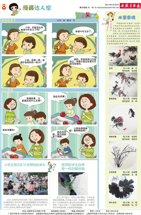 笑话笑画 小学生雨中扶50多辆倒地单车 老师怕学生自卑穿一样的解放鞋 神奇画笔