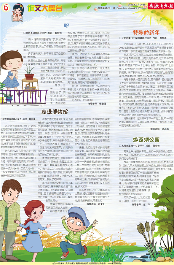 《安徽青年报·学生周刊》励志启智,开阔视野,净化心灵,陶冶情操,参与互动,集新闻性、知识性、趣味性、互动性为一体,是小学生成长的良师益友、参与互动的平台、沟通老师家长的纽带。