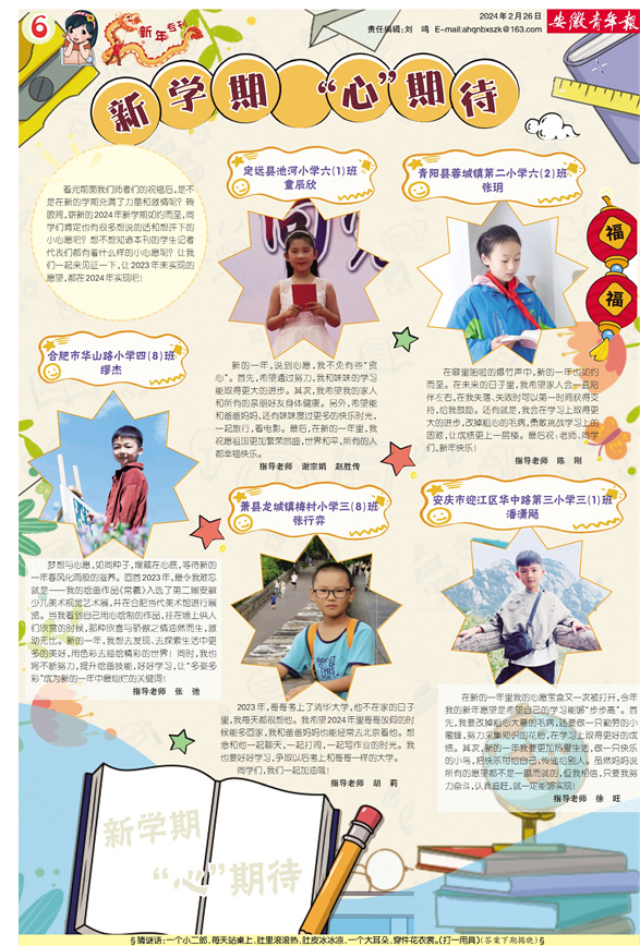《安徽青年报·学生周刊》励志启智,开阔视野,净化心灵,陶冶情操,参与互动,集新闻性、知识性、趣味性、互动性为一体,是小学生成长的良师益友、参与互动的平台、沟通老师家长的纽带。