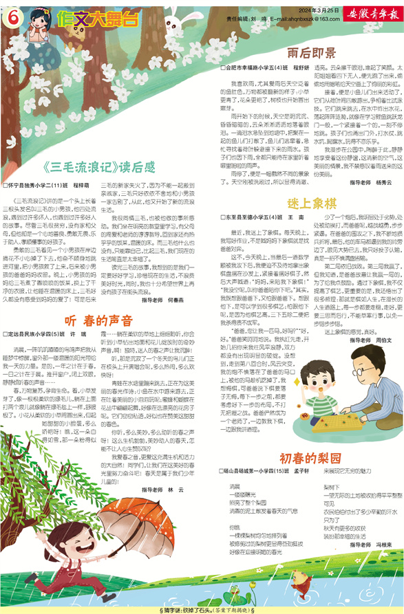 《三毛流浪记》读后感 雨后即景 迷上象棋 听 春的声音 初春的梨园