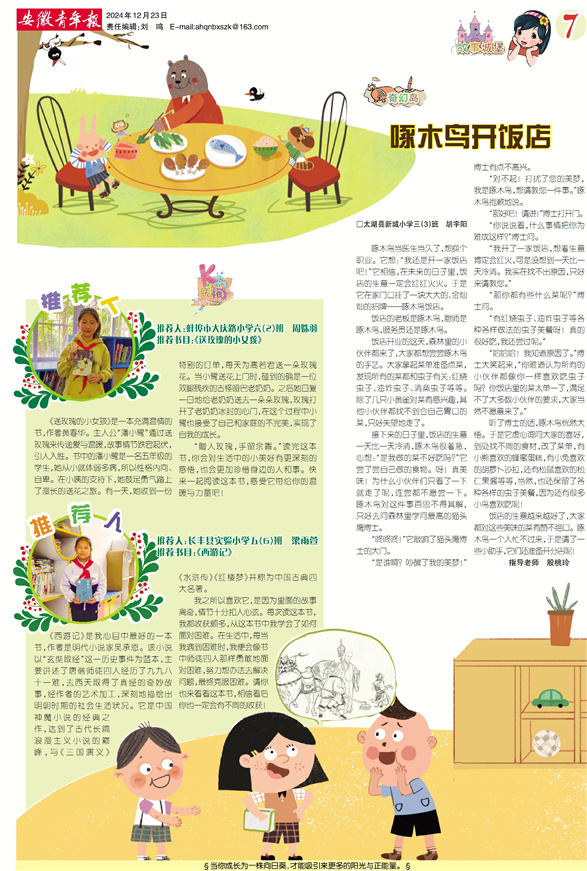 《安徽青年报·学生周刊》励志启智,开阔视野,净化心灵,陶冶情操,参与互动,集新闻性、知识性、趣味性、互动性为一体,是小学生成长的良师益友、参与互动的平台、沟通老师家长的纽带。