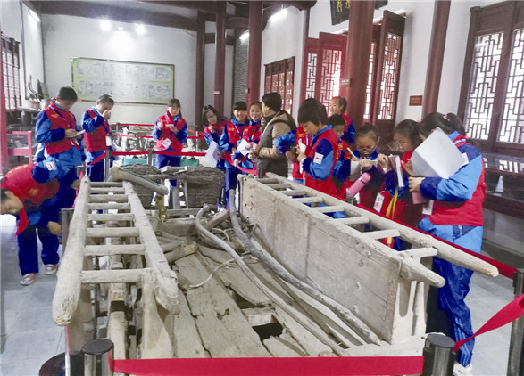 活动第一站,学生记者走进长临河古镇,跟随讲解员贺艳阿姨来到民俗文化馆。带着泥土芳香的木头制品引起了学生记者们的兴趣,“阿姨,请问,这些木制品是古代农耕时用的吗?它们的形状好奇怪啊。”“是的,这些铡刀、风车、水车曾是我们万家湖口码头非常重要的一类运输工具。一般的马车轮子是木制的,而这个轮子外面包了一层铁,这样做是为了延长使用时间。”