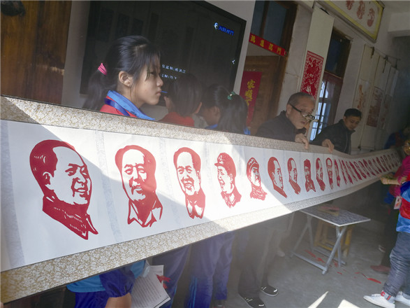 牛爷爷还向大家展示他创作的毛主席各个时期的肖像剪纸,看着这副巨作,学生记者都禁不住竖起大拇指。为了传承剪纸手艺,适应时代发展,牛爷爷不仅自编了一套学生教材,还每周都前往长临河学区中心学校,教授孩子们剪纸课程。“同学们,一定要将我们的传统文化传承下去。”