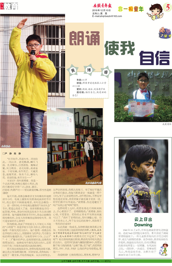 黄博睿 年龄:11岁 班级:蚌埠市前进路第二小学六(1)班 爱好:朗诵、游泳、吹奏葫芦丝 座右铭:相信自己,做更好的自己! □严 静 陈 静 “红日初升,其道大光。河出伏流,一泻汪洋。潜龙腾渊,鳞爪飞扬。乳虎啸谷,百兽震惶。鹰隼试翼,风尘吸张。奇花初胎,矞矞皇皇。干将发硎,有作其芒。天戴其苍,地履其黄。纵有千古,横有八荒。前途似海,来日方长……” 大家好!我叫黄博睿。我是一个活泼开朗,性格乐观的小男孩,我的兴趣爱好非常广泛:游泳、插花、打篮球、吹葫芦丝……要说最爱的嘛,那当然是朗诵喽! 每天早晨,我都会捧着语文书有模有样地朗读半小时。电视上播放有关朗诵或演讲的节目时,我总是目不转睛地观看,有时还会模仿一二。前一段时间,中央电视台播放的“诗词大会”节目,更是让我看入了迷。我常常跟着选手们一起答题,吟咏,课余时间我还找来许多古诗词朗读背诵。每当播放喜剧类节目时,我也总能模仿得有模有样,全家人经常被我逗得哈哈大笑。我可是家里的开心果呀! 因为朗诵,我成了学校里无人不知无人不晓的“小明星”!我是学校少先队大队长,同时还是每周一升旗仪式的主持人。每个星期一我都会站在学校的主席台上,用铿锵有力的声音,号召着全校的师生整理队伍,“全体同学听口令,立正!”“一!二!”整齐的声音,在校园里回荡,这使我变得更加自信。能够成为升旗仪式的主持人,还要归功于我三年级参加的那次演讲比赛呢。 是不是很帅气啊 那天我在班级里读书,老师发现我读得不错,就让我去参加朗诵比赛。回到家里,我和妈妈一起找了一篇文章,开始苦练起来。从认字到发音,从声音到表情,我都认真练习。为了练好平翘舌音和前后鼻音,我每天跟着录音一练就是一两个小时;为了让表情更自然,动作更自如,不管在学校还是在家里,我看到镜子就在镜子前比一比。同学们都开玩笑地说:“黄博睿,你这是魔怔了吗?”而我总是“呵呵”傻笑。 在即将要上台时,我紧张得在后场转来转去,手心都冒汗了。老师鼓励我:“黄博睿,放松心情,不要紧张。把你的正常水平发挥出来就可以了。”我听了老师的话,及时调整心情。功夫不负有心人,终于在全区的比赛中,我取得了一等奖的好成绩! 从此我就一炮成名,各种朗诵比赛我都去参加。大家在电视上也能看到我的身影,(因为,我参加了蚌埠市电视台举办的“铃儿响叮当”少儿语言大赛,进入决赛啦!)我都有点忙不过来了,“嘻嘻”!校长得知我擅长朗诵,聘请我为学校大晨会的主持人。在同学们羡慕与佩服的眼神中,我更加勤于练习我的朗诵。“业精于勤,荒于嬉”,我要再接再厉,多听、多读、多练!让我的声音传得更远,更远…… 我爱朗诵!它使我更自信,更优秀,更帅气! 我获奖啦