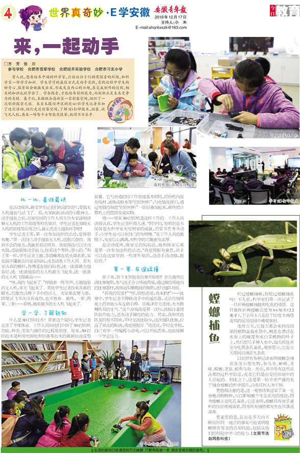 有人说,想要培养中国的科学家,应该让孩子们拥有探索的环境,和科学家一样学习知识。学生学习的最佳方式是动手实践,实践过程中学生的好奇心、探索欲会被激发出来,形成发自内心的兴趣,在完成制作的过程,相关的知识也就学会了。学会探索,才能培养创新能力,而创新正是未来竞争力的关键。基于此,本报联合高新区一家创客空间,组织了一次创新探索之旅。来自本报经开区的近60位学生记者参加了这次活动,他们走进创客空间,了解3D打印技术,组装、试飞无人机,再来一场智斗士智能竞技赛,玩得不亦乐乎。