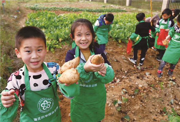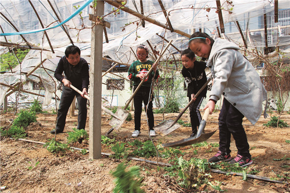一起给葡萄苗苗锄草 铜陵市瑞龙小学有个校园种植农场,校园种植农场分班级管理,每个班级的老师带领同学们栽种各种蔬菜、农作物等。通过种植,同学们不仅可以学会种植小技巧,还能掌握辨认各种植物,可谓是寓教于乐!在每年收获的季节里,各班级开展劳动成果分享会,瓜果品尝会,学校组织同学们把新鲜的蔬菜送到市儿童福利院,与福利院的孩子们共同分享劳动果实。 立柱、篱架、盖棚、下苗,完成这几个步骤,葡萄的小苗苗就种植成功了。在马鞍山市新工房小学,有着一帮种植葡萄的小能手。新工房小学将学校内一块七百平方米的空间开拓成七彩葡萄种植园基地。七彩葡萄园种植基地体现了新工房小学倡导学生“走出教室,体验生活”的绿色办学理念,是为全面实施素质教育并切实提高学生劳动技能和实践水平的重要措施。