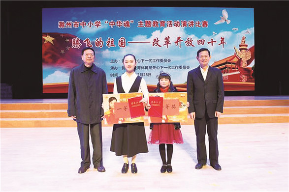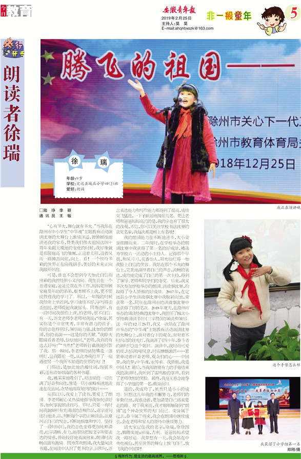 □陆 琤 李 颖 通 讯 员 王 敏 “心有多大,舞台就有多大。”当我站在滁州市中小学生“中华魂”主题教育活动演讲比赛的大舞台上激情洋溢,铿锵顿挫地讲述我的家乡,赞美我们伟大祖国这四十周年来翻天覆地的变化的时候,我好像就是那展翅高飞的雏鹰,正迎着太阳,迎着风雨一路搏击向前,向上。看!一个缤纷多彩的世界正在向我招手,美好的未来正向我敞开怀抱。 可是,谁也不会想到今天如此自信而出彩的我曾经胆小又内向。我生长在一个普通家庭,爸爸长期在外工作,妈妈要照顾家庭及年幼的弟弟,根本顾不上我,更不要说管理我的学习了。所以,一年级的时候我经常上学迟到,学习成绩不好,字写得歪歪扭扭,老师提起我就摇头。因为这样,有一段时间我很怕上课,怕老师,很不自信。有一天,语文老师李老师对我说:“徐瑞,其实你是个非常优秀,非常有潜力的孩子。你的音色特别好,领悟能力强,比如你的朗诵,你的表演……这是你的天赋。”我睁大眼睛看着老师,怯怯地问,“老师,我真的有这么好吗?”“当然!”老师斩钉截铁地回答了我。那一瞬间,李老师的话仿佛是一盏明灯,让我眼前一亮,从此为我打开了一扇通往另一个我所不知道的世界的大门! 门那边,是如此地浩瀚壮阔,绚丽多彩,还有浩如烟海的各种书籍。 我,被深深地吸引了,对这里的一切充满了好奇和向往,像是一只小蜜蜂痴迷地流连在花丛间,贪婪地汲取知识的蜜汁…… 从那以后,我爱上了读书,更爱上了朗诵。李老师耐心又热情地指导我如何读好书,如何掌握朗读技巧。平时,只要一有时间我就倾听有关诵读的音频作品,逐字逐句逐行地读、品,判断每个字的正确读法,注意纠正自己的发音,不断地揣摩和学习。坚持了一段时间后,我的音色变得更加纯粹清亮,吐字清晰、有力,能很快把握文字所要表达的情感,并能较好地表演出来,朗诵时流畅而富有激情。因为喜欢朗诵,我大量阅读书籍,在阅读中认识了更多的字、词和句,语言表达能力和写作能力都得到了提高,成绩突飞猛进,一下子跃居班级前几名。更让老师和爸爸妈妈高兴的是,我的字也有了很大的改观,不信,你可以关注学校书法比赛的获奖名单,我每次都是榜上有名哦! 我的朗诵能力在不断地进步,大小荣誉接踵而来。二年级时,在学校举办的朗诵比赛中我获得了第一名的好成绩,被选为学校六一活动的小主持人。记得那个早晨,和风习习,花香怡人,阳光灿烂得一如我脸上自信的笑容。我站在那个不大的舞台上,完美地演绎着自己的声音,流畅的表达,成功地完成了自己的第一次主持,得到了领导、老师和同学们的夸奖。后来,我又多次参加学校举办的朗诵、讲故事比赛,均取得了令人骄傲的好成绩。2017年,在定远县小学生讲故事比赛中我脱颖而出,荣获第一名,同年在滁州市的讲故事比赛中也获得了好的名次。2018年夏天,在滁州市举办的诵读经典的比赛中,我担任了城北小学经典诵读节目《三字经》的领读和领唱。这一年的12月25日,我又一次站在了滁州市举办的“中华魂”主题教育活动演讲比赛的大舞台上,面对着台下的观众,面对着不时闪动的镁光灯,我演讲了《四十年,奋斗者的新时代》这个题目。演讲中,我时而可爱俏皮,时而喑哑叹息,时而慷慨激昂……紧紧牵动着评委老师、观众们的心——中国梦,我的梦;中华魂,永传承。我骄傲,我是中国人!最后,当我用铿锵有力的手势结束我的演讲时,我听到了雷鸣般的掌声,看到了老师欣慰的笑脸。最终,我毫无悬念地夺得了小学组的第一名,载誉而归。 是的,我成功了,虽然只是小小的成功。回想这几年我的不懈努力,老师们的辛勤付出,我感动着,更加清楚自己将来要走的路。对于我来说,我才刚刚触碰到“朗诵”这个神奇世界的大门而已。荣誉属于过去,奋斗属于将来,我会在朗诵中继续成长,会在老师和家人的期待中继续努力。 请大家记住我的名字:徐瑞,徐徐图之,脚踏实地;祥瑞,吉利。爸爸妈妈希望我一路好运。我梦想有一天,我会站在中央电视台,甚至世界的舞台上放飞自己,放飞我的中国梦!