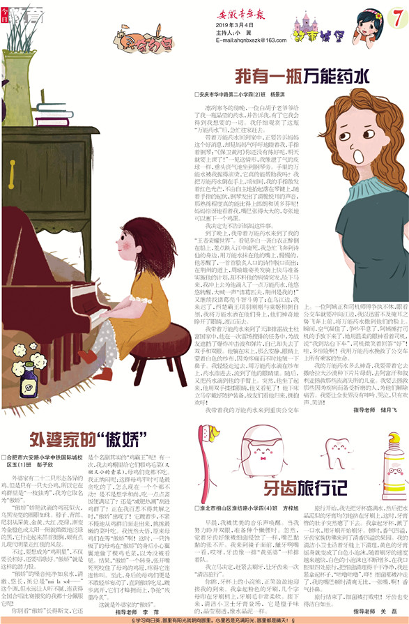 □安庆市华中路第二小学四(2)班 杨景淇 凛冽寒冬的傍晚,一位白胡子老爷爷给了我一瓶晶莹的药水,并告诉我,有了它我会得到我想要的一切。我仔细观赏了这瓶“万能药水”后,急忙往家赶去。 带着万能药水回到家中,正要告诉妈妈这个好消息,却见妈妈气呼呼地瞪着我,手指着钢琴:“《保卫黄河》你还没有练好呢,明天就要上课了!”一见这情形,我像泄了气的皮球一样,垂头丧气地坐到钢琴旁。手里的万能水被我握得滚烫,它真的能帮助我吗?我把万能药水倒在手上,顷刻间,我的手指散发着红色光芒,不由自主地抬起落在琴键上,随着手指的起伏,钢琴发出了清脆悦耳的声音,那熟练程度真的能比得上郎朗和贝多芬呢!妈妈惊讶地看着我,嘴巴张得大大的,夸张地可以塞下一个鸡蛋。 我决定先不告诉妈妈这件事。 到了晚上,我带着万能药水来到了我的“王者荣耀世界”。看见李白一袭白衣正醉倒在船上,差点跌入江中淹死,我急忙飞奔到诗仙的身边,用万能水抹在他的嘴上,慢慢的,他苏醒了,一首首脍炙人口的诗作脱口而出;在荆州的道上,周瑜雄姿英发骑上快马准备实施他的计划,却不料他的病情突发,坠下马来,我冲上去为他滴入了一点万能药水,他悠悠转醒,大喊一声“诸葛匹夫,荆州是我的!”又继续找诸葛亮斗智斗勇了;在乌江边,我来迟了,西楚霸王项羽刚刚与虞姬相拥自刎,我将万能水洒在他们身上,他们神奇地睁开了眼睛,渡江而去。 我带着万能药水来到了天津排雷战士杜富国家中,他在一次雷场搜排的任务中,为战友遮挡了爆炸冲击波和弹片,自己却失去了双手和双眼。他躺在床上,那么安静,眼睛上蒙着白色的纱布,因为疼痛而不时地皱一下鼻子。我轻轻走过去,用万能药水滴在纱布上,药水渗进去,流到了他的眼睛里。随后,又把药水滴到他的手臂上。突然,他坐了起来,他用双手揉揉眼睛,他又看见了!他下床立马穿戴好防护装备,战友们看他归来,拥抱欢呼! 我带着我的万能药水来到重庆公交车上。一位阿姨正和司机师傅争执不休,眼看公交车就要冲向江边,我以迅雷不及掩耳之势飞奔上前,将万能药水撒到他们的脸上。瞬间,空气凝住了,争吵平息了,阿姨捶打司机的手放下来了,她用温柔的眼神看着司机,说“我到站台下车”,司机微笑着回答“好”!哇,多惊险啊!我用万能药水挽救了公交车上所有乘客的生命。 我的万能药水多么神奇,我要带着它去撒哈拉大沙漠种下片片绿荫,去阿富汗和叙利亚拯救那些流离失所的儿童。我要去拯救那些因为疾病而备受折磨的人,为他们解除痛苦。我要让全世界没有呻吟、哭泣,只有欢声、笑语! 指导老师 储月飞