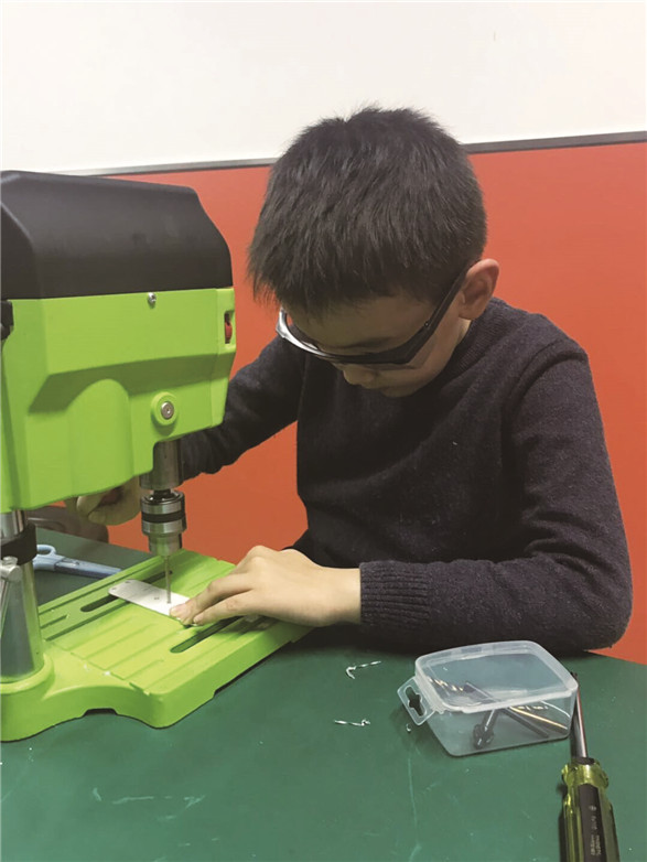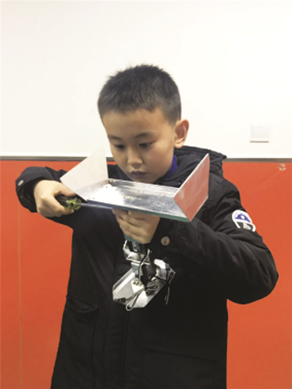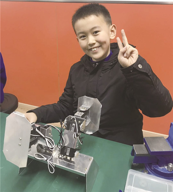 不过呢,在组装的过程中,遇到了一些问题。我发现,其中有一块铝做的大U支架,怎么也无法准确地组装上,似乎尺寸上有些偏差,我折腾了好一阵,对它又敲又锯,也没有组装好,甚至把大U支架整个弄废了。不过我没有放弃,我气呼呼地拿出备用零件,又比对了之前的图纸,重新进行了切割钻孔。功夫不负有心人,这下我终于把这捣乱的大U支架重新做好了。就在大家全神贯注地组装机器人的时候,我旁边的方同学已经第一个组装完成了,他兴奋地把自己的机器人展示给大家看。大家一看他手里的机器人,一个个笑得前仰后翻,原来,他把机器人的两只腿安装反了。我赶紧看了一下自己手里的机器人,还好,没有装反,我又仔细检查了一下其他地方,确定没有任何问题,才开始给机器人进行编程。编程结束后,才算是真正的大功告成了。瞧!他傻傻的铝片脑袋配上两条大长腿,两只眼睛黑亮黑亮……虽然这不是我理想中机器人的样子,可仍旧让我爱不释手!