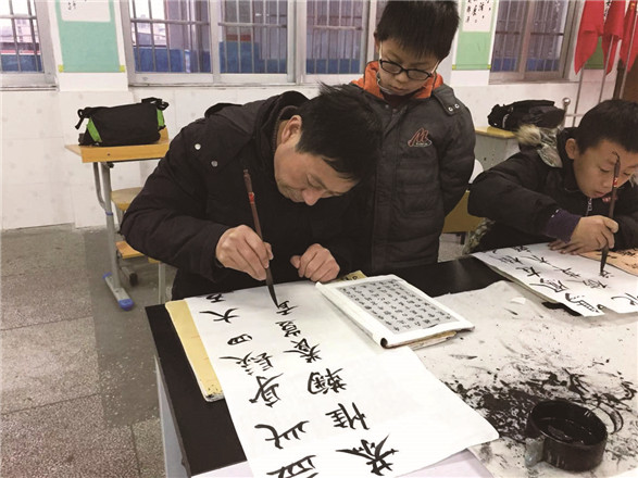 “老大老二对对齐,手指之间留缝隙,老三下面来帮忙,老四老五往里藏……”安庆市龙狮桥乡中心学校书法教室里,在书法老师吴跃军的带领下,同学们用稚嫩的声音,齐声朗诵握笔口诀。