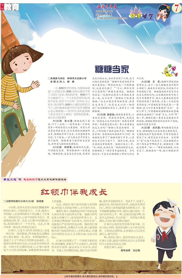 □合肥市稻香村小学六(5)班 徐靖惠 小时候,看到大哥哥大姐姐们佩戴着鲜艳的红领巾,不禁羡慕不已。后来,跨进小学的校门,在老师的教导下我也戴上了红领巾。我如获至宝,心里不知道有多高兴。我清楚地记得,第一次系上红领巾时的激动心情,我向队旗行了一个举手礼。从此,红领巾伴我一路走来,伴我茁壮成长。 红领巾,它是少先队队员的标志,也是一种信仰。我致敬她,因为她是高高飘扬的五星红旗的一角,那火一样燃烧的鲜红,是成千上万个革命先烈的鲜血染成的。红旗指引着革命的方向,红色成为光明的希望。中国少年先锋队的成立,红领巾成为每个少先队员的标配,承载着做革命接班人的重量。 从此,我把红领巾视为我最宝贵的财富,伴我在人生的起步路上,永不迷失方向。 戴着红领巾,我就想起刘胡兰姐姐在敌人面前英勇不屈的伟大形象。她最后惨死在敌人的铡刀下,成为党的优秀儿女。毛主席题词赞扬她“生的伟大,死的光荣”。这就是共产党员的崇高品格。胸前的红领巾越发的鲜艳,仿佛在告诉我,做人就要做像刘胡兰姐姐那样的人,对革命事业,对建设中国特色社会主义无限忠诚,永远不改初心。 红领巾向我展示了一个绚丽多彩的世界,使我懂得,要做共产主义接班人,要实现伟大的中国梦,就必须从小多读书,读好书。书是人类智慧的结晶,是时代进步的阶梯,是科学创新的抓手。书读多了,读透了,就能运用,知识能改变世界,也能改变我们自己,使自己成为祖国强大的栋梁之才。每当我静静地捧起书本,我的心就沉浸在一片灿烂的阳光之中。啊,这知识的海洋啊,你是多么的神奇,多么的宽广。世界每天都是新的,只有红领巾的鲜红依旧。 红领巾让我的世界变得多姿多彩。红色与初心相伴,是我前进路上永不消失的光辉。它助我走出困境,走出迷茫;它让我充满信心,意气风发。 啊,我的红领巾,是你伴我快乐成长。红领巾之路,就是中国特色社会主义思想新时代儿童成长的必由之路。 我爱红领巾,永远。 指导老师 汪红梅