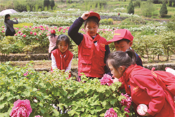 这里的万亩牡丹园,景色非常壮观。一朵朵雍容华贵的牡丹争奇斗艳,芬芳迷人,有白的、黄的、红的、桃红的、紫色的……有的花开似碗口那么大,蔡梦琪弯下腰,仔细观察一朵红牡丹,它的叶子像枫叶,那一层一层的红色花瓣包裹着金黄的花蕊,在绿色叶子的衬托下显得格外美丽。有些还是含苞欲放的花骨朵儿,“它就像一位害羞的小姑娘,遮遮掩掩地不敢见我。”