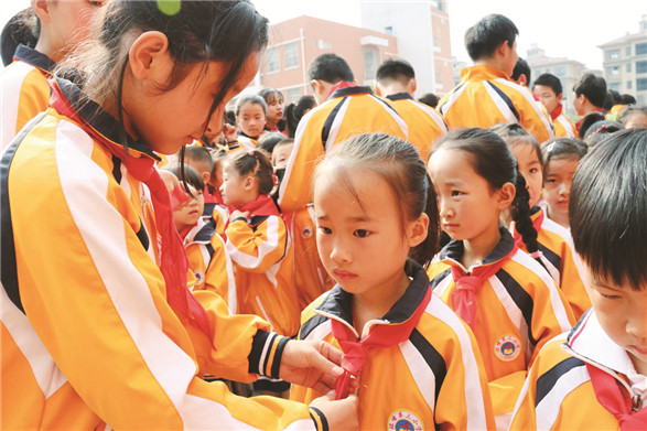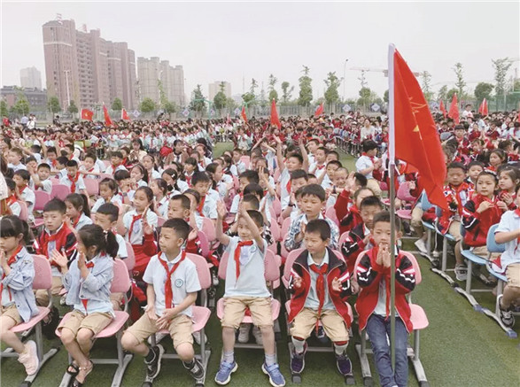 5月31日,含山县环峰第三小学少先队举办“争做新时代好队员”入队仪式,在雄壮有力的国歌声中,全校325名一年级同学向学校少先大队提出申请今天正式加入中国少年先锋队。在歌曲《红领巾之歌》中,六年级各中队队员代表为新队员佩戴鲜艳的红领巾。新队员在大队长的带领下,面向队旗庄严宣誓,铮铮誓言表达了他们对少先队组织的向往和热爱。