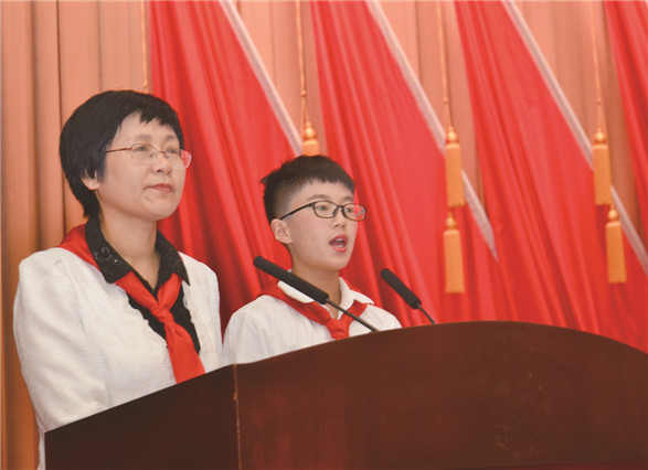 省第六次少代会现场,少先队员代表胡子阳,同省第五届少工委主任李丹云一起,做了《奋进新时代共筑中国梦 团结带领广大江淮少年为建设现代化五大发展美好安徽做好全面准备》的工作报告。