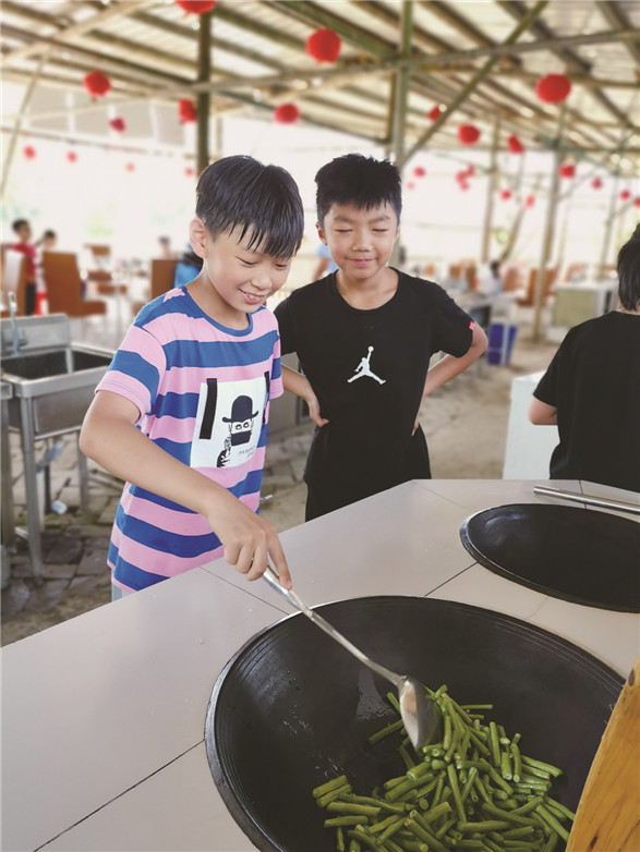 纸上得来终觉浅,平日里衣来伸手、饭来张口的小萌娃们,在这次夏令营中,终于有大展身手的机会了。下午,夏令营一行来到轩辕农庄,亲手做了一顿从来没有操作过的大锅饭。大家分工有序,你切菜来我刷锅,你生火来我掌勺,在和灶台进行长达1小时的激烈斗争后,红烧豆角、麻婆豆腐隆重出锅。可别说,味道真不错呢!
