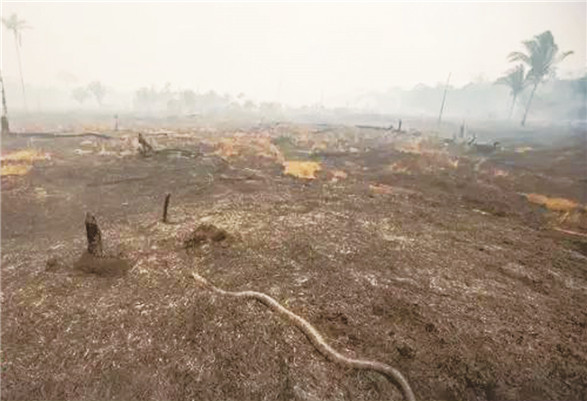 然而,大火却令它满目疮痍……8月26日,英国《卫报》报道了亚马孙雨林火灾的航拍画面。视频中一片荒芜景象,蟒蛇在光裸的土地上爬行,让人很难联想起曾经如世外仙境般的绿色海洋……