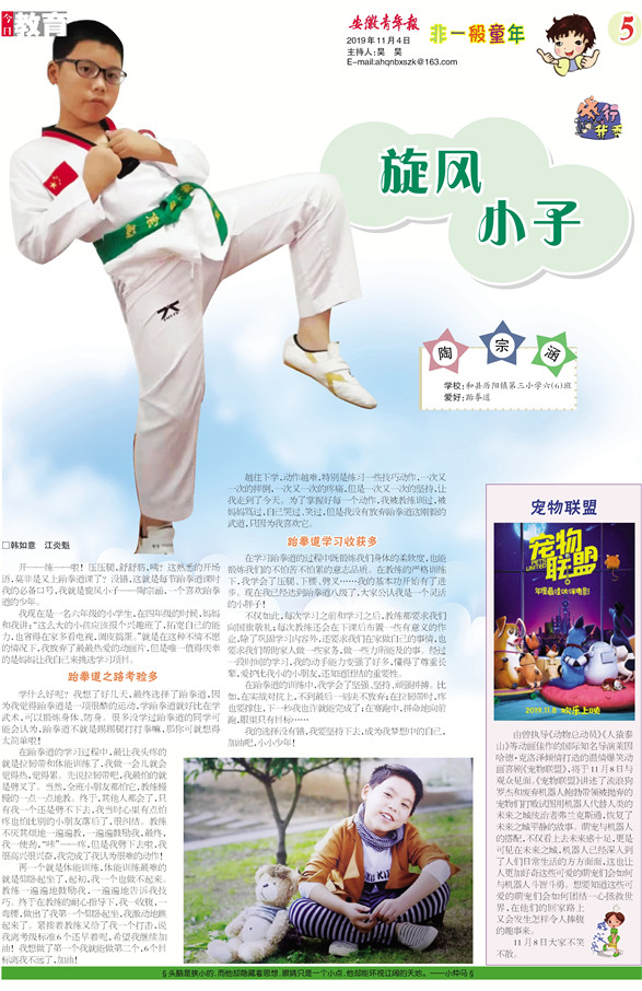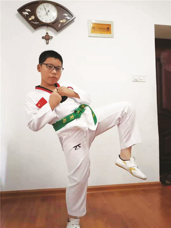 开——练——啦!压压腿,舒舒筋,咦?这熟悉的开场语,莫非是又上跆拳道课了?没错,这就是每节跆拳道课时我的必备口号,我就是旋风小子——陶宗涵,一个喜欢跆拳道的少年。