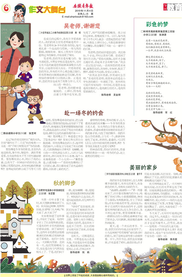 《安徽青年报·学生周刊》励志启智,开阔视野,净化心灵,陶冶情操,参与互动,集新闻性、知识性、趣味性、互动性为一体,是小学生成长的良师益友、参与互动的平台、沟通老师家长的纽带。