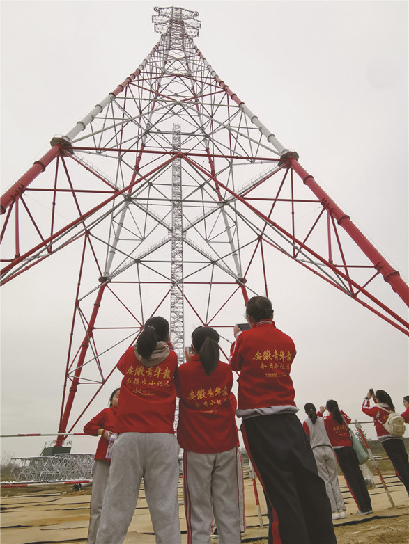 在南润段淮河大坝,驰入眼界的是一望无垠的田野。驻足眺望,一座高塔矗立眼前。塔尖直指苍穹,上方书写着“淮河大跨越”几个大字。据了解,淮河大跨越工程共由两座输变电跨越铁塔、四座锚塔组成,塔高277米,单座塔重1300吨,跨距1900米,分别跨越在淮河两岸的颍上县与霍邱县境内,为淮河边最高的输电通道铁塔。学生记者们边听边记,切身感受到了建设者们那种敢为人先、真抓实干、创新争先的拼搏精神。