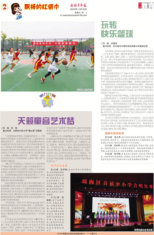 六(2)班 彭瑞希:由于成绩不太好,导致我在班级一直都是默默无闻、胆小自卑的,进入合唱团让我改变很多,在老师的指导下我的演出水平有了很大的进步,在同学们吃惊和羡慕的眼神里,我也变得更加自信了。