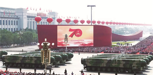 10月1日上午,在国庆70周年大阅兵中,东风-41核导弹方队在32个装备方队中压轴出场。这是东风-41核导弹首次公开亮相。揭开神秘面纱的同时,电视直播的解说词中介绍:“战略制衡、战略慑控、战略决胜,东风-41洲际战略核导弹,是我国战略核力量的中流砥柱!”