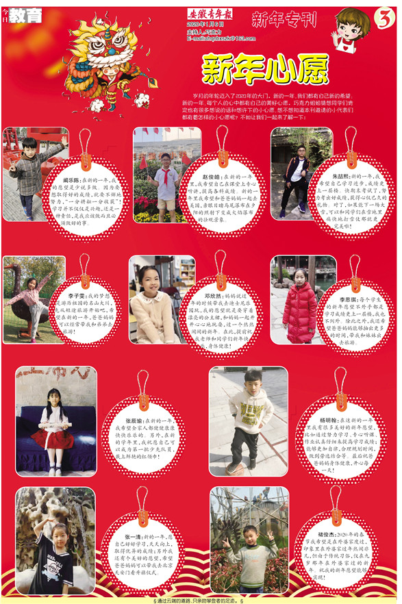 李思琪:每个学生的新年愿望不外乎都是学习成绩更上一层楼,我也不例外。除此之外,我还希望爸爸妈妈能够抽出更多的时间,带我和妹妹出去旅游。 张辰瑜:在新的一年,我希望全家人都健健康康快快乐乐的。另外,在新的学年里,我祝愿自己可以成为第一批少先队员,戴上鲜艳的红领巾! 杨明翰:在这新的一年里我有很多美好的新年愿望,比如通过努力学习、专心听课、作业认真仔细来提高学习成绩;能够更加自律,合理规划时间,做到劳逸结合等。最后祝爸爸妈妈身体健康,开心每一天!