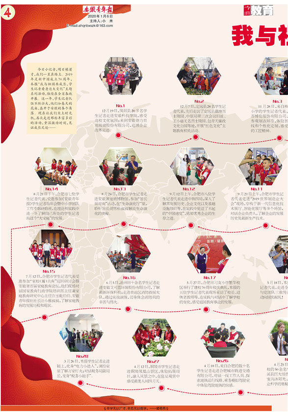 今日小记者,明日栋梁才,我们一直在路上。2019年是新中国成立70周年,本报“我与祖国共成长,学生记者看身边大变化”主题系列活动,陆续在全省各地开展。这一年,学生记者队伍不断壮大,他们如春天的花朵,盛开于安徽的各个角落。现在让我们坐上时光机,再次走进那些丰富多彩的活动,重温激动时刻,见证成长足迹……