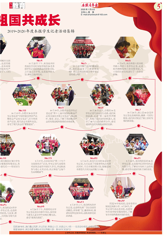今日小记者,明日栋梁才,我们一直在路上。2019年是新中国成立70周年,本报“我与祖国共成长,学生记者看身边大变化”主题系列活动,陆续在全省各地开展。这一年,学生记者队伍不断壮大,他们如春天的花朵,盛开于安徽的各个角落。现在让我们坐上时光机,再次走进那些丰富多彩的活动,重温激动时刻,见证成长足迹……