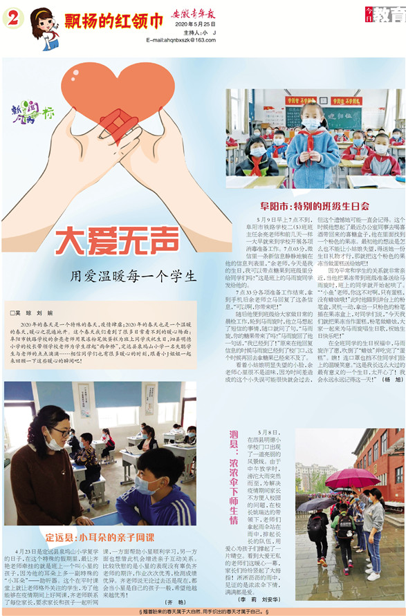 2020年的春天是一个特殊的春天,疫情肆虐;2020年的春天也是一个温暖的春天,暖心之花遍地开。这个春天我们看到了很多日常看不到的暖心场面:阜阳市铁路学校的余亮老师用果冻粉笔做蛋糕为班上同学庆祝生日,泗县明德小学的校长带领学校老师为学生撑起“雨伞桥”,定远县泉坞山小学一名失聪学生与老师的点点滴滴……相信同学们也有很多暖心的时刻,跟着小J姐姐一起来回顾一下这些暖心的瞬间吧!