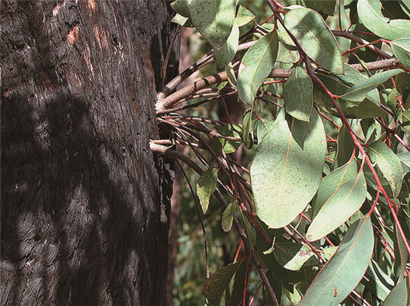 几乎每一个酷热的旱季,澳大利亚丛林都会升腾起烈火和浓烟。为了在如此绝境求得一线生机,自我修剪树干低处的枝叶,以及发展木质块茎和植冠种子库,简直是众多澳大利亚桉树的基本操作。不过,在树皮深层暗藏无数休眠的表皮芽,才是桉树家族中最流行的火灾生存大招。在外层树皮的严密保护之下,大多数表皮芽会在火灾中成功幸存。这些表皮芽会在雨季得到激活,让焦黑的桉树树干从根到梢发出不计其数的新枝。