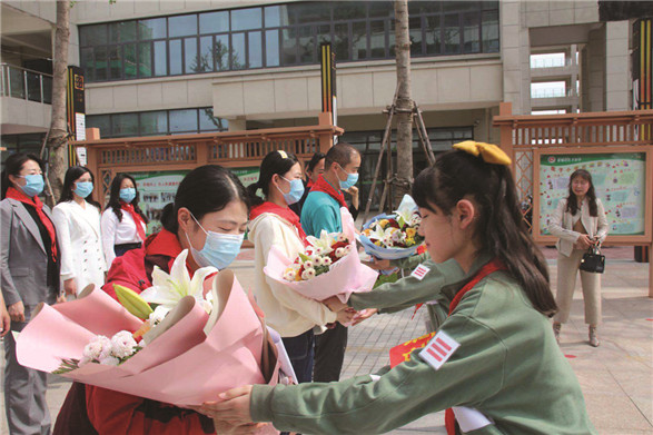 听完报告的学生记者们深受感触,报告结束后,学生记者们用标准的少先队礼向三位驰援湖北凯旋而归的英雄致敬,并敬献鲜花。