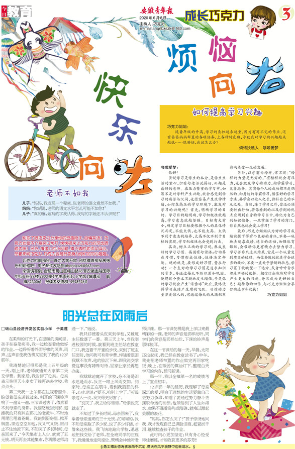 《安徽青年报·学生周刊》励志启智,开阔视野,净化心灵,陶冶情操,参与互动,集新闻性、知识性、趣味性、互动性为一体,是小学生成长的良师益友、参与互动的平台、沟通老师家长的纽带。