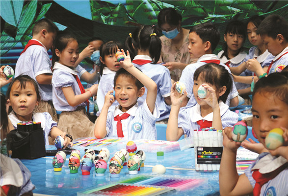 手拿画笔的是一年级小学生们。在老师的引导下,他们笔底春风,体会彩绘鸭蛋的乐趣。还有穿针引线的同学,是在学习缝香囊。大家选择自己喜欢的中药材和布料花色,一针一线,转眼间,一个个粽子形状的香囊就在同学们的巧手中完成了。董子宁同学好奇地问道:为什么端午节要吃鸭蛋缝香囊?老师说道,端午预示着炎炎夏日的来临,农历五月也被称为“毒月”,是容易引发疾病和热毒的季节。而鸭蛋性凉微寒,滋阴清肺;香囊里的中草药,可以祛毒养生,因此渐渐就形成端午节食鸭蛋缝香囊的习俗。