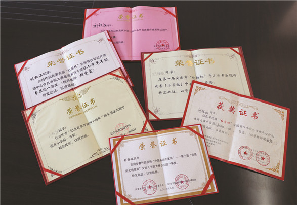 从坐姿、执笔、画线条再到横、竖、点、撇、捺,每天重复练习。时而结构不好,时而不到位,时而布局没把握好。这时,我除了手酸,心里更酸。每当这时候,我都强忍着坚持下去。一千多个日子的坚持和付出,我的字越写越好,学校“两读两写”窗内经常有我的书法作品,我也经常参加各级书法比赛并且屡获佳绩。在安庆市“纪念改革开放四十周年”现场书法大赛中获得全市小学组一等奖,去年我还获得安徽省“党是阳光我是苗”书画大赛少儿组一等奖。书法带给我的不仅是荣誉,它更能磨炼我的耐性。