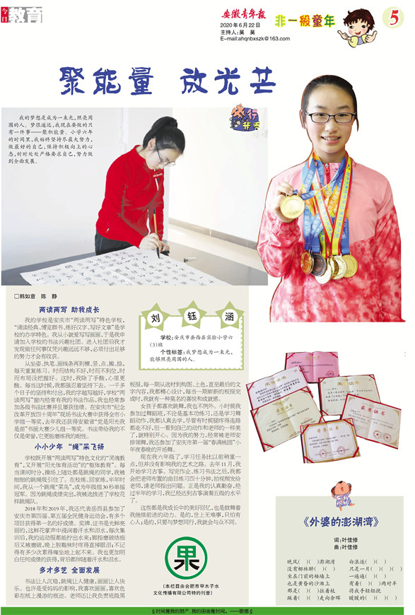 我的学校是安庆市“两读两写”特色学校,“诵读经典、博览群书、练好汉字、写好文章”是学校的办学特色。我从小就爱写写画画,于是我申请加入学校的书法兴趣社团。进入社团后我才发现做任何事仅凭兴趣远远不够,必须付出足够的努力才会有收获。