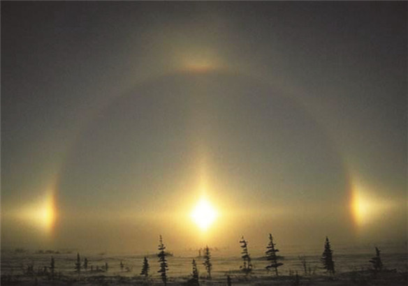 11月18日,黑龙江漠河。天空出现幻日奇观,好似出现“3个太阳”。据了解,幻日是一种比较罕见的大气光学现象,是冰晶折射所形成的,对气象条件的要求比较严格。同时出现的七色彩虹叫“环天顶弧”,也是因光线折射产生。