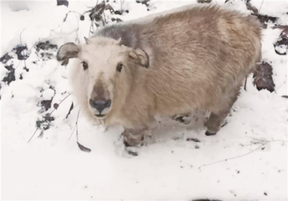 近日,陕西太白山景区工作人员在景区房屋后发现一只小羚牛。据观察,这只羚牛年龄1岁左右。据悉,羚牛是一种大型牛科食草动物,为国家一级保护动物。工作人员从这只羚牛宝宝在雪地里一脸好奇的神情,推测出这应该是小家伙见到的第一个冬天。