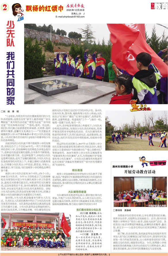 “小J姐姐,你现在所处的位置就是我们的少先队活动室哦,这里还设有‘留守儿童咨询室’‘音乐舞蹈室’‘美术制作活动室’‘硬笔书法室’‘读书阅览室’‘阳光体育活动室’。”“是呢,是呢。在这里,我们队员们真正能够感受到幸福感、光荣感、组织感和归属感,温馨而又充满活力……”在灵璧县灵城镇南李小学(以下简称南李小学)的少先队活动室里,小队员们争先恐后地向小J姐姐介绍着学校少先队的各种特色。