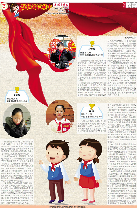 在学习中她有着一股钻劲儿,虚心好问,一丝不苟,从一年级到六年级一直担任班长和语文课代表,曾连续三年获得“三好学生”“优秀班干部”等荣誉称号,并年年获得学校的“读书标兵”“明德励行小标兵”等荣誉称号,写作获得过区级作文比赛三等奖。荣紫怡同学一直具有强烈的集体荣誉感,身为语文课代表,她勤勤恳恳地为班级、为同学服务,也总是不厌其烦地帮助后进生解答疑难,耐心讲解,希望所有同学都能取得进步。
