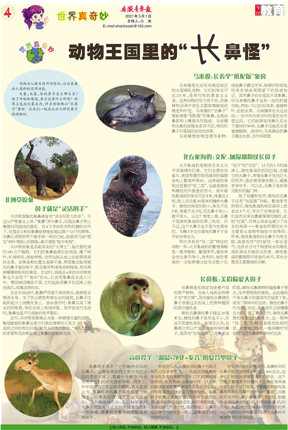 大象,大象,你的鼻子怎么那么长?除了呼吸和嗅闻,鼻子还有什么作用?世界上包括大象在内,许多动物都以“长鼻子”著称。让我们一起来认识几种长鼻子的动物吧。