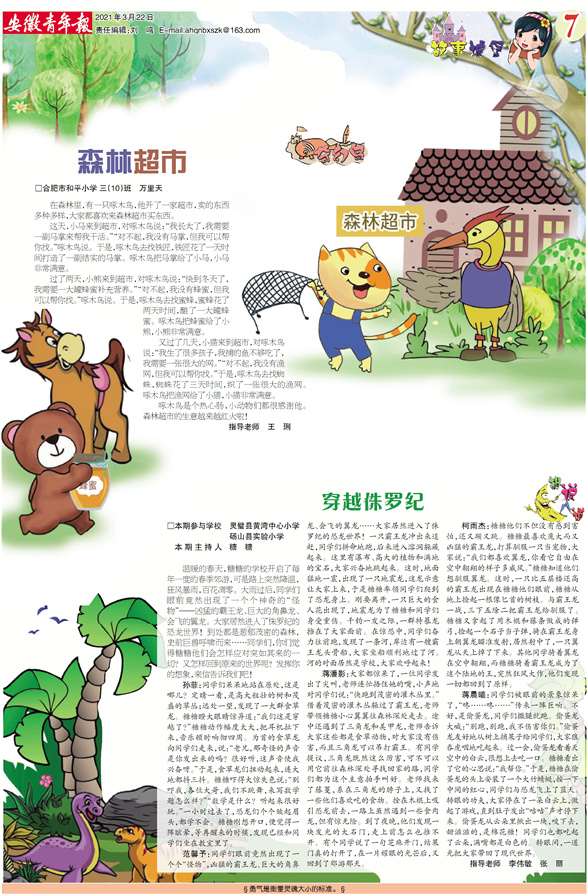 奇幻岛 森林超市 □合肥市和平小学 三(10)班 万里天 在森林里,有一只啄木鸟,他开了一家超市,卖的东西多种多样,大家都喜欢来森林超市买东西。 这天,小马来到超市,对啄木鸟说:“我长大了,我需要一副马掌来帮我干活。”“对不起,我没有马掌,但我可以帮你找。”啄木鸟说。于是,啄木鸟去找铁匠,铁匠花了一天时间打造了一副结实的马掌。啄木鸟把马掌给了小马,小马非常满意。 过了两天,小熊来到超市,对啄木鸟说:“快到冬天了,我需要一大罐蜂蜜补充营养。”“对不起,我没有蜂蜜,但我可以帮你找。”啄木鸟说。于是,啄木鸟去找蜜蜂,蜜蜂花了两天时间,酿了一大罐蜂蜜。啄木鸟把蜂蜜给了小熊,小熊非常满意。 又过了几天,小猫来到超市,对啄木鸟说:“我生了很多孩子,我捕的鱼不够吃了,我需要一张很大的网。”“对不起,我没有渔网,但我可以帮你找。”于是,啄木鸟去找蜘蛛,蜘蛛花了三天时间,织了一张很大的渔网。啄木鸟把渔网给了小猫,小猫非常满意。 啄木鸟是个热心肠,小动物们都很感谢他。森林超市的生意越来越红火啦! 指导老师 王 琍
