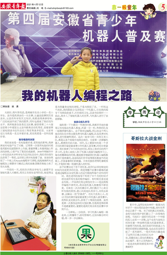 《安徽青年报·学生周刊》励志启智,开阔视野,净化心灵,陶冶情操,参与互动,集新闻性、知识性、趣味性、互动性为一体,是小学生成长的良师益友、参与互动的平台、沟通老师家长的纽带。