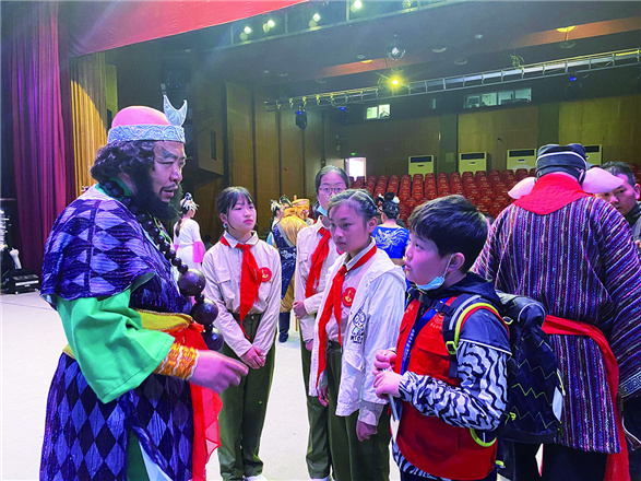 在化妆室,暖黄的灯光投射在四周,每位演员都在有条不紊地进行着演出前的准备。很多学生记者首次近距离观察这些演员,都十分好奇。张东辰看见一个胖胖的叔叔正对着镜子化妆,便好奇地问道:“叔叔,你演的是哪个角色?”那位演员没有直接回答,却是用粗粗的嗓音模仿了一段剧里的话:“二师兄,你说的对!”然后让小记者猜。哦,原来,他演的是三师弟沙和尚!