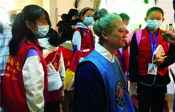 房间的西边坐着演白头老翁的演员。他身穿蓝白相间的古装,头戴假发,化妆师帮他插上了一支银簪子,为他贴上白银色的胡子。这样一看,真的很像故事情节中的“白头老翁”呐!一番等待后,“白头老翁”睁开了眼睛,模仿着低沉有劲的声音,笑着对大家说:“小记者们,你们好!知道我是谁吗?”来自屯溪路小学五(7)班的王熙悦情不自禁地笑了:“呵呵,您不是演白骨夫人化身的白头老翁吗?”“是啊,你真聪明。”低沉有力的声音再一次从演员的嘴里传出来。