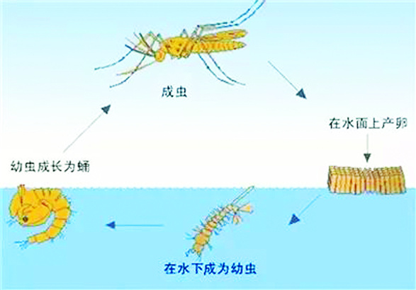 蚊子一生要经历卵、幼虫、蛹、成虫四个阶段。一只蚊子一生能产1000~3000个卵,它们通常在水中或水边产卵,卵孵化后1~2天变成幼虫,也叫孑(jié)孓(jué);孑孓也在水中或水边生活,靠吃水里的微生物生存,孑孓在5~7天时间之内经过4次蜕皮之后会变成蛹;蛹再经过2~3天就能完全成熟,变成成虫,也就是我们平时所说的蚊子。可以说蚊子1~2周之内即可繁殖一代,且每次繁殖的数量也极其可观。