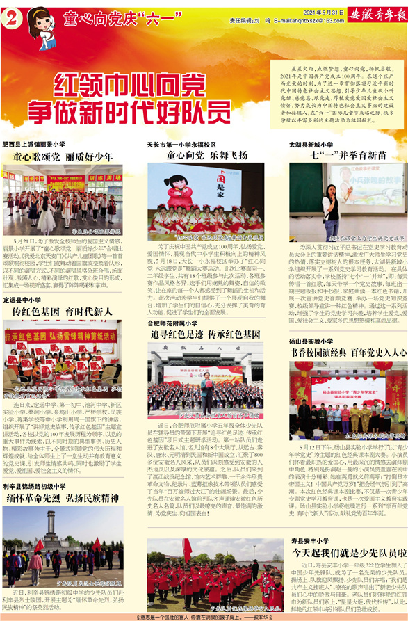 连日来,定远中学、第一初中、池河中学、新区实验小学、桑涧小学、泉坞山小学、严桥学校、民族小学、蒋集学校等中小学利用周一国旗下的讲话,组织开展了“讲好党史故事,传承红色基因”主题宣讲活动,各校以党的100年发展历程为顺序,以党的重大事件为线索,以不同时期的典型事例、历史人物、精彩故事为主干,全景式回顾党的伟大历程和辉煌成就,给全体师生上了一堂生动并有教育意义的党史课,引发师生情感共鸣,同时也激励了学生爱党、爱祖国、爱社会主义的情怀。