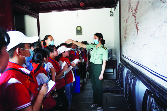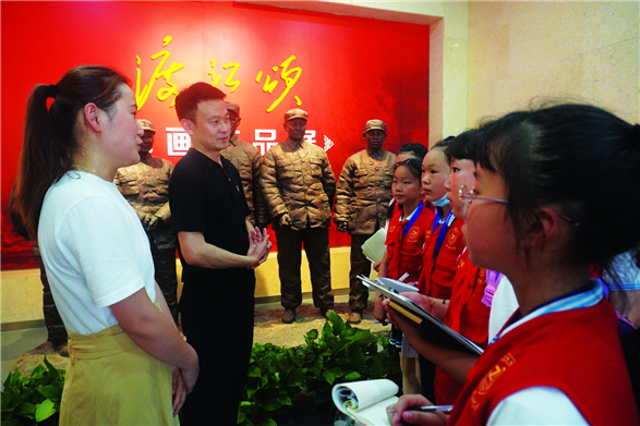 工作人员为学生记者介绍纪念馆概况